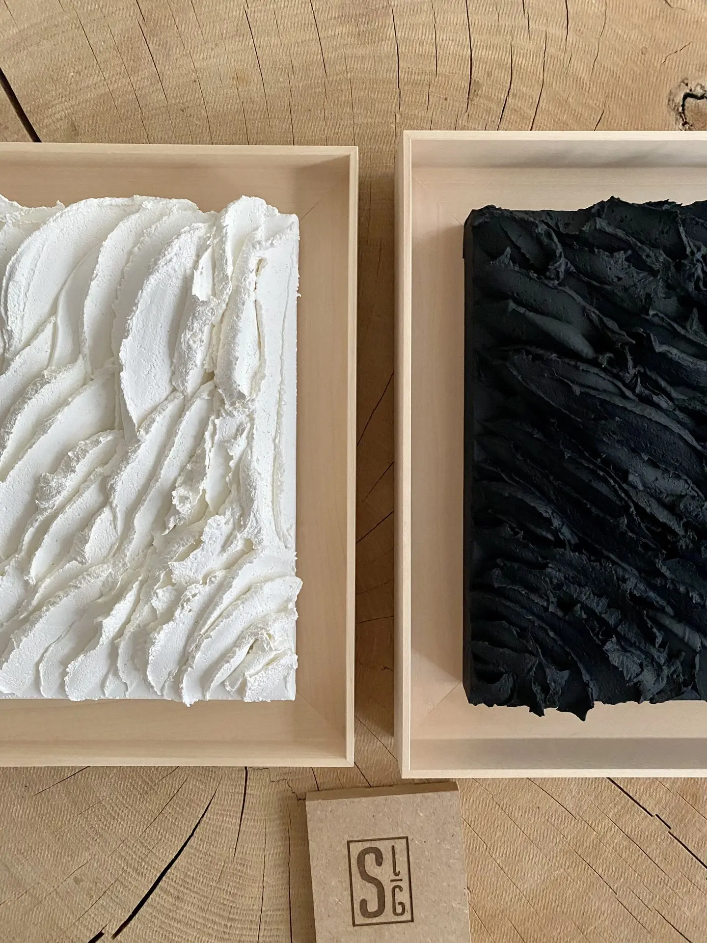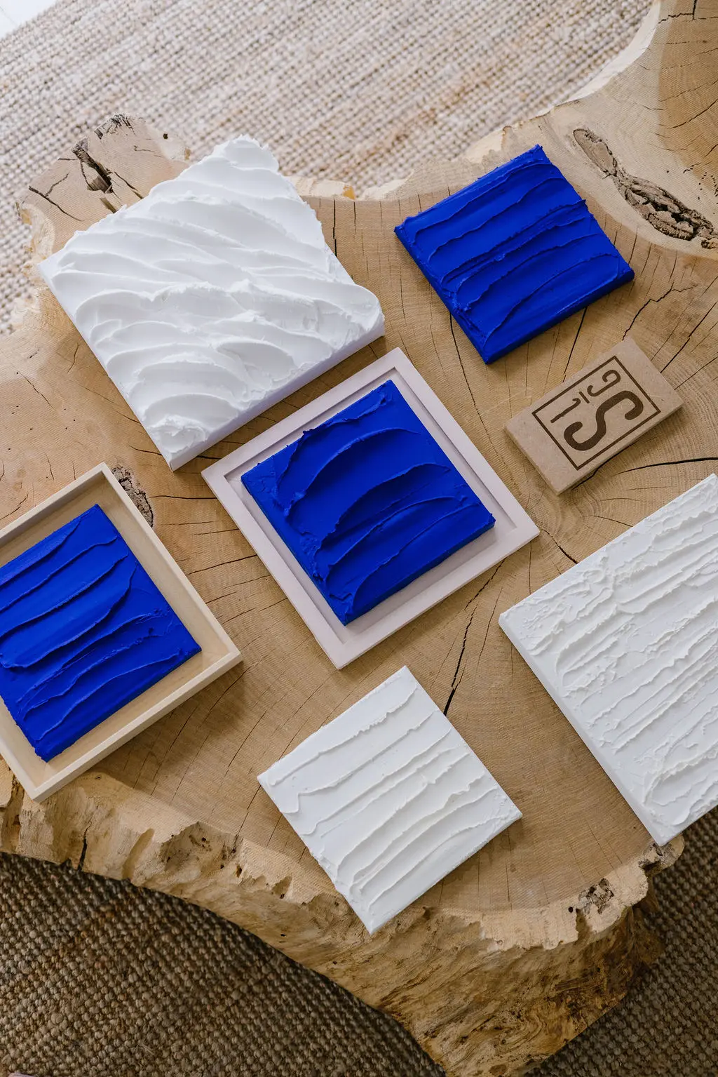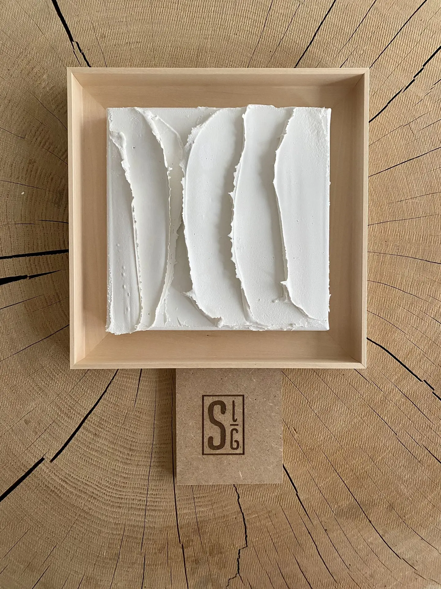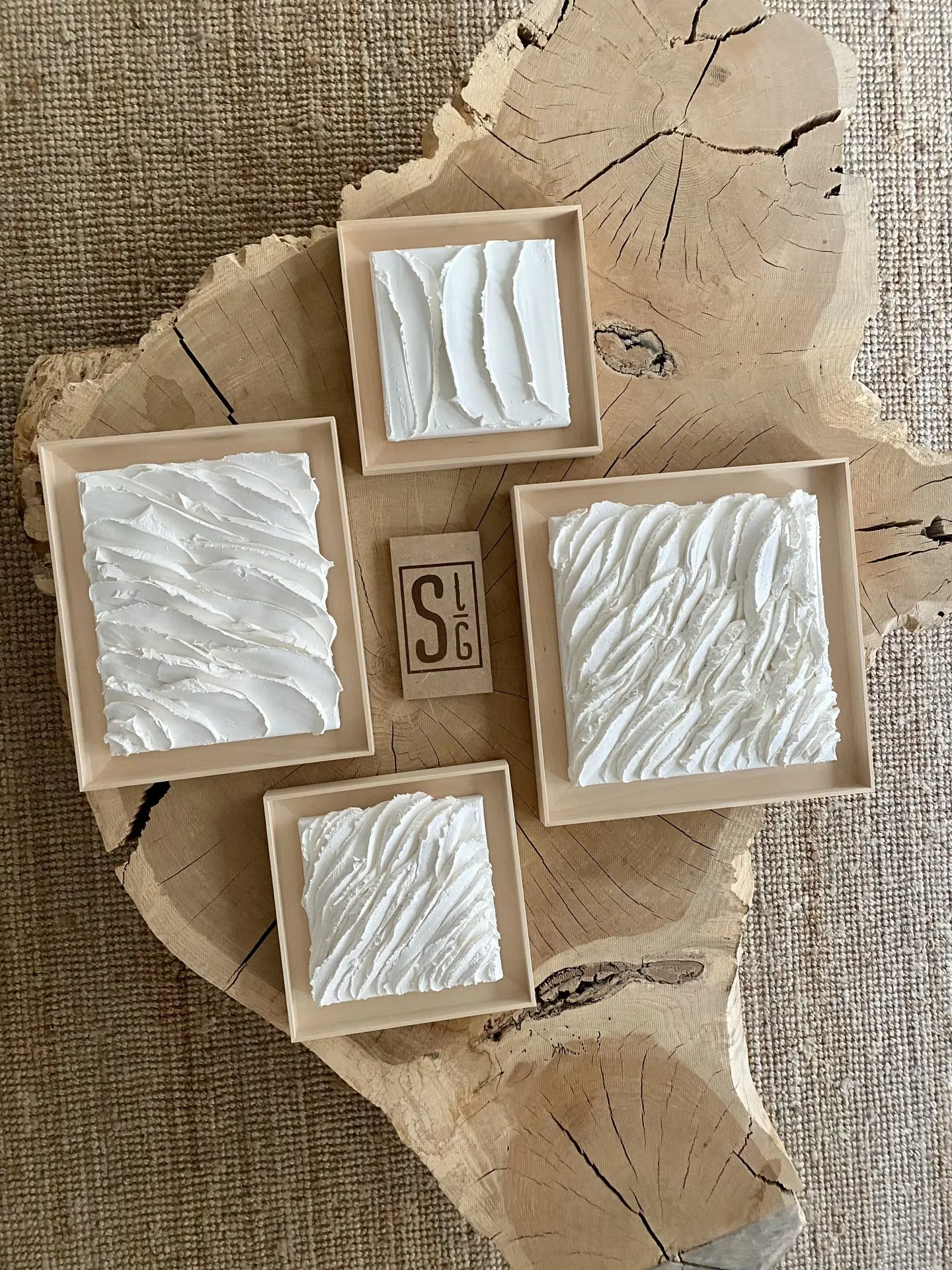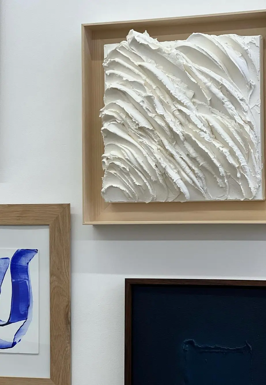 "Ocean Cream", une série de toiles miniatures, délicates et captivantes, où chaque texture varie entre finesse aérienne et épaisseur généreuse. Matière et texture effleurent la toile avec légèreté ou rappellent une crème onctueuse, qu’on imagine presque pouvoir effleurer du doigt.